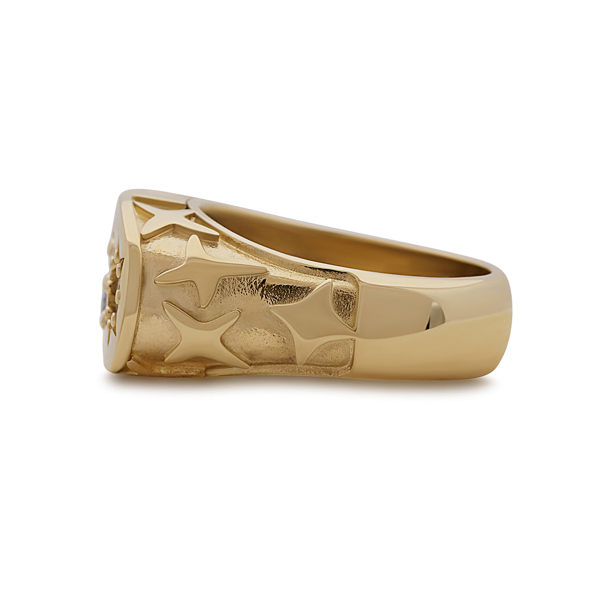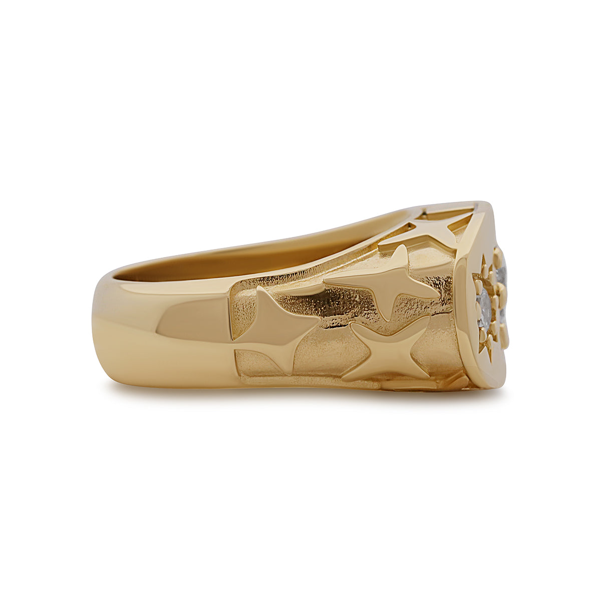 | A handmade gypsy ring crafted from 9ct yellow gold featuring 3 gem-set cubic zirconia's with a starburst design, the style of the stars are continued on the shoulders of the ring with a repeated pattern. The item is stamped with a British Hallmark. |