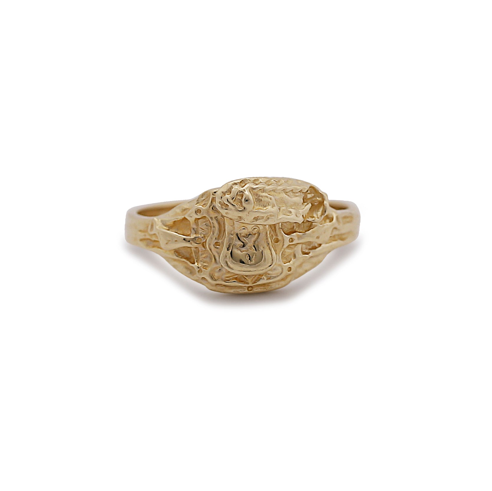 A handmade saddle ring crafted from 9ct yellow gold featuring details of the saddle with a rope and stirrups finished with our signature scroll pattern. The item is stamped with a British Hallmark