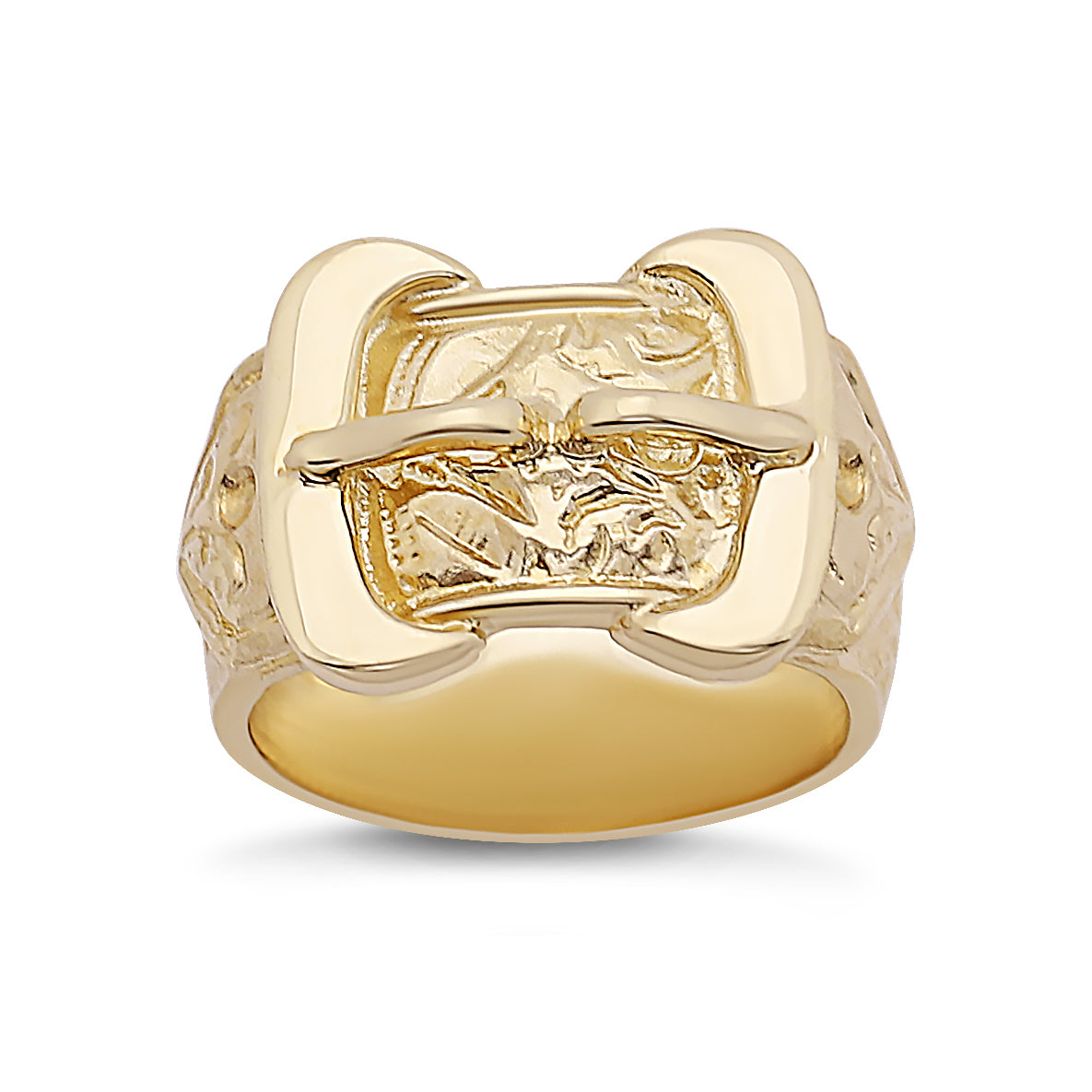A handmade polished double buckle ring crafted from 9ct yellow gold featuring our signature scroll pattern with a double buckle belt design. The item is stamped with a British Hallmark