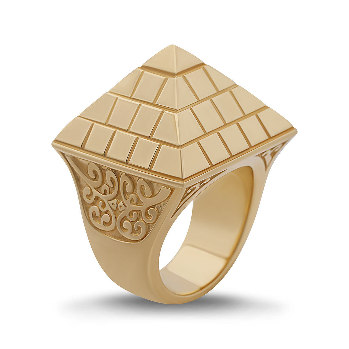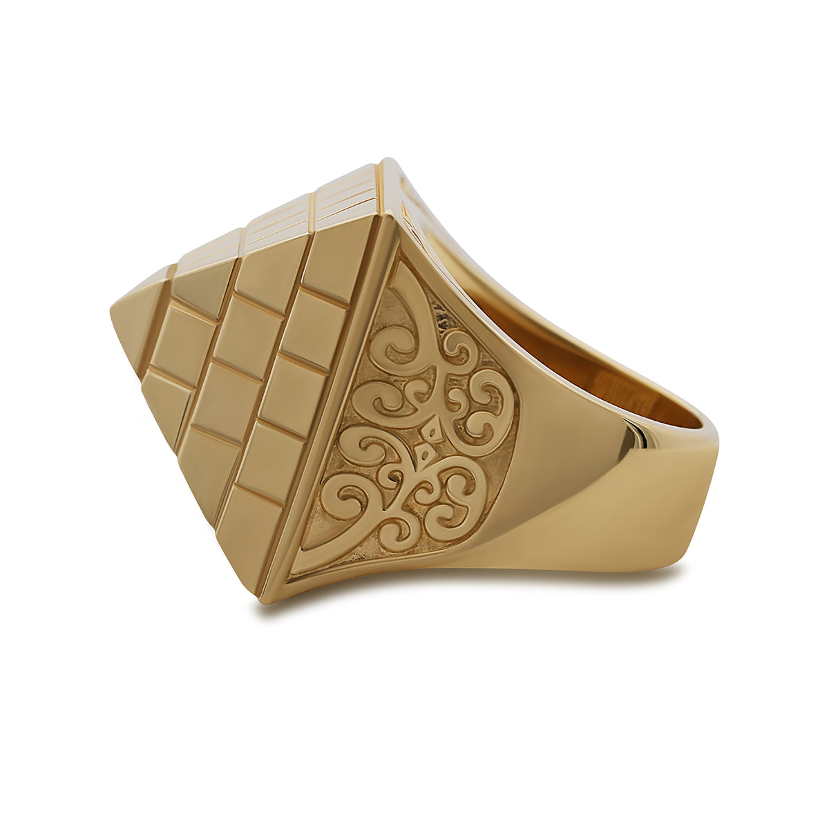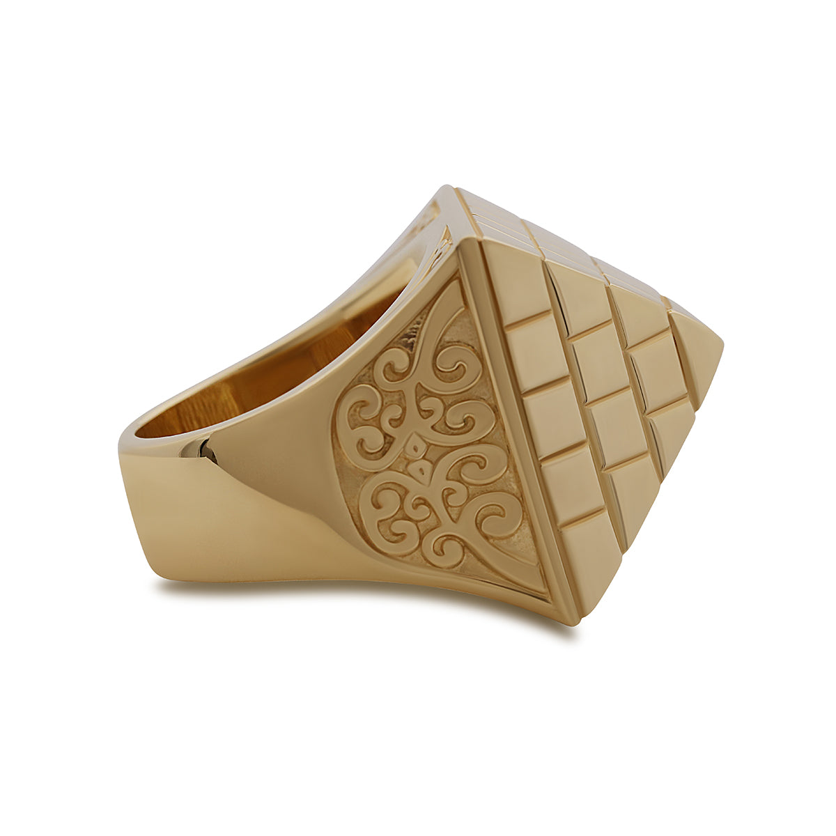 | A handmade pyramid ring featuring our signature scroll textured shoulders which comes together perfectly with the sleek polished finish of the pyramid, specifically designed for a big weight and big look. The item is stamped with a British Hallmark. |