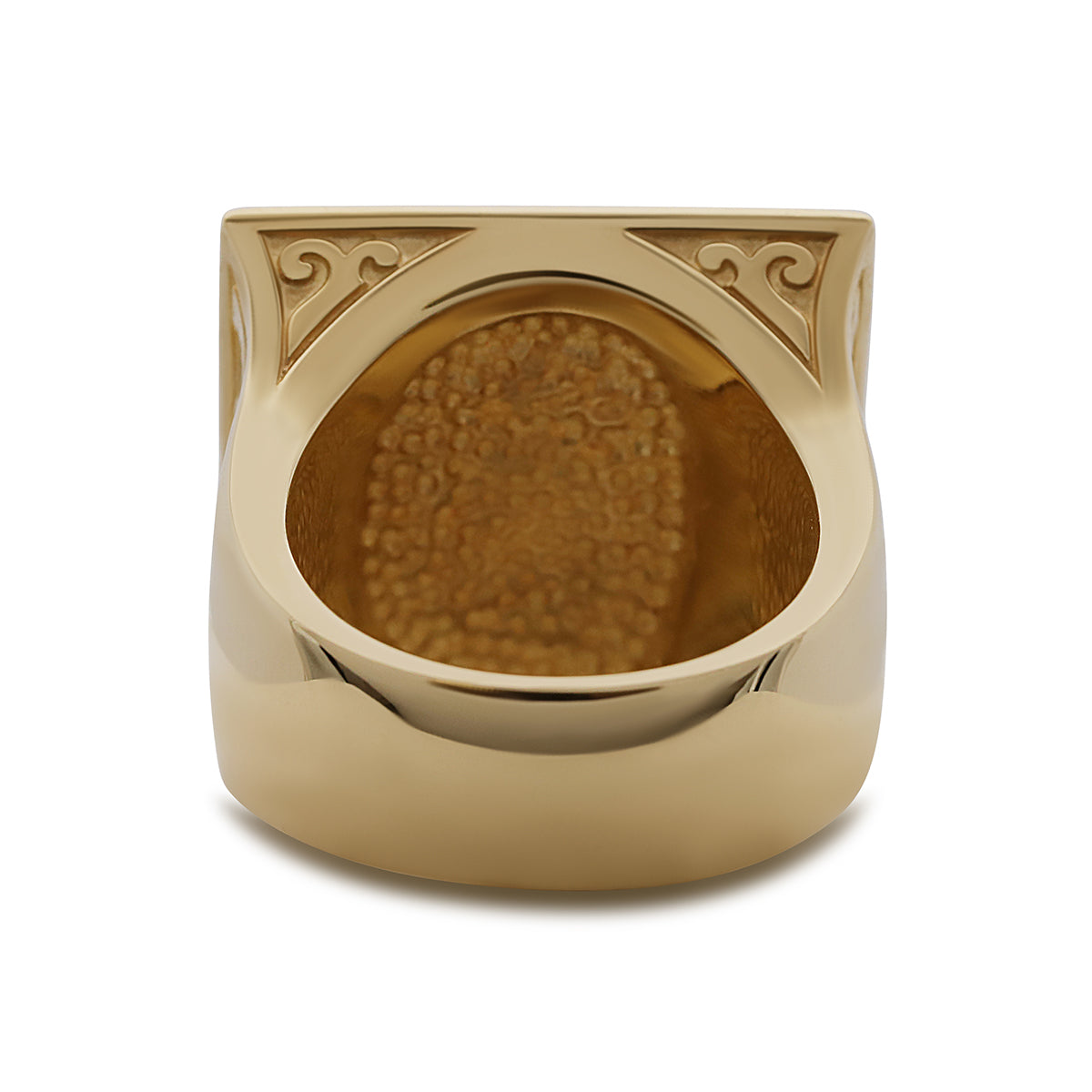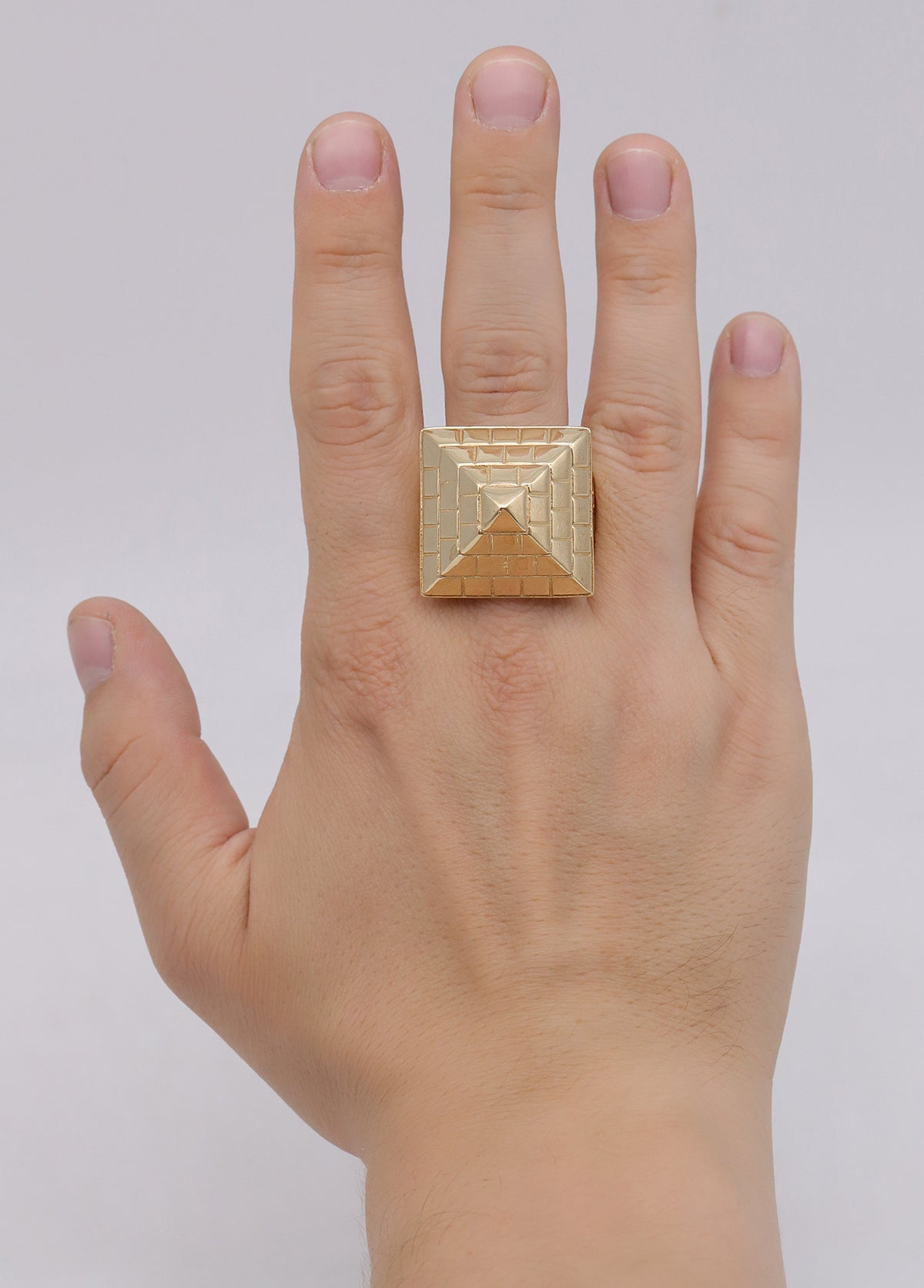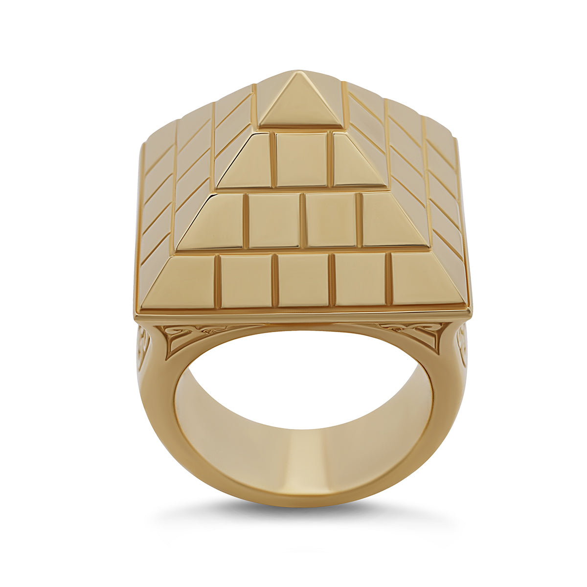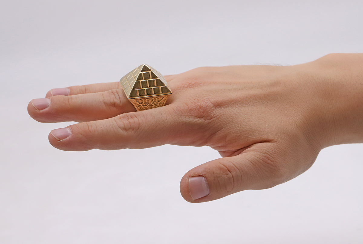 | A handmade pyramid ring featuring our signature scroll textured shoulders which comes together perfectly with the sleek polished finish of the pyramid, specifically designed for a big weight and big look. The item is stamped with a British Hallmark. |