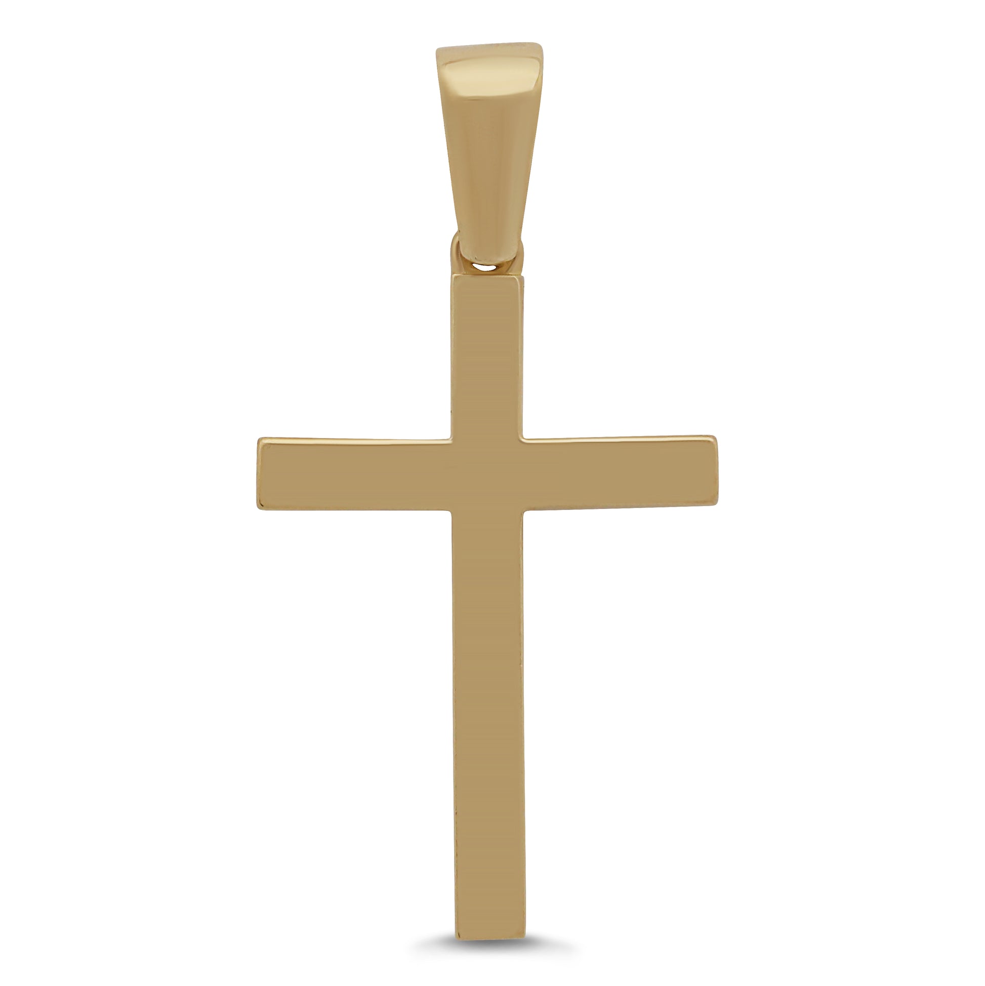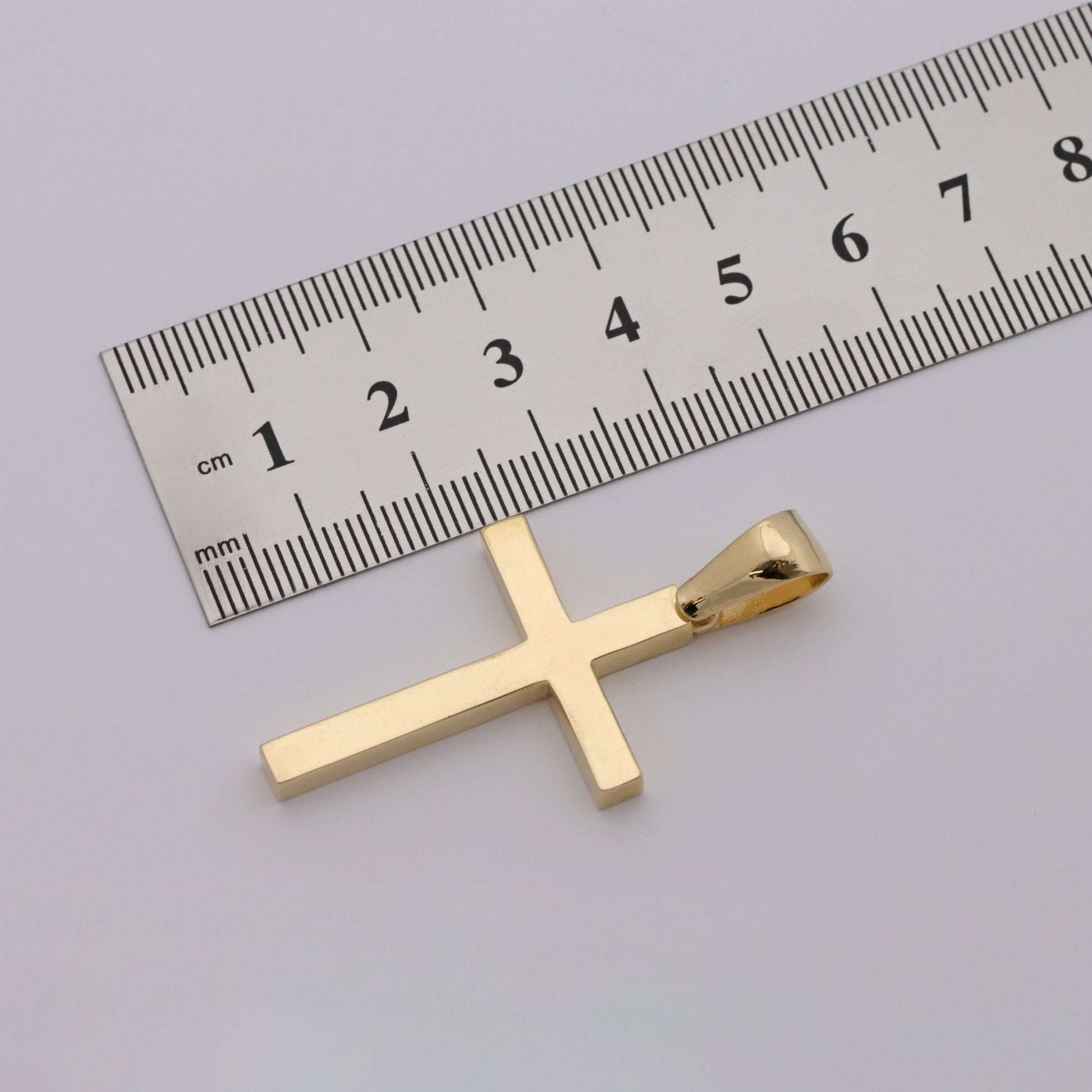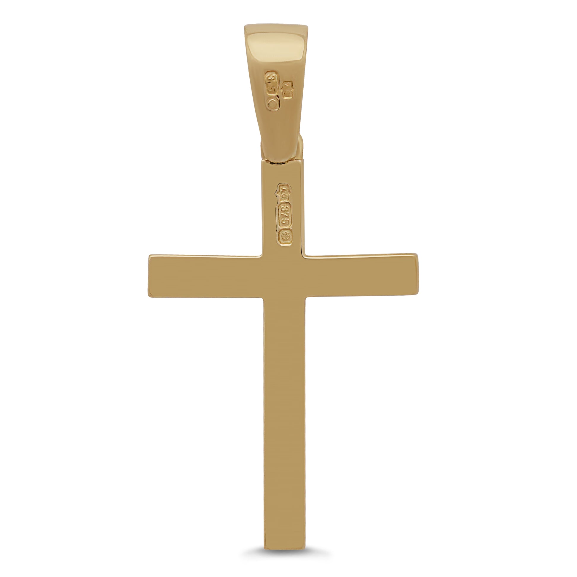 A handmade cross crafted from 9ct yellow gold featuring a classic polished cross with a high shine to the front and back. The item is stamped with a British Hallmark.